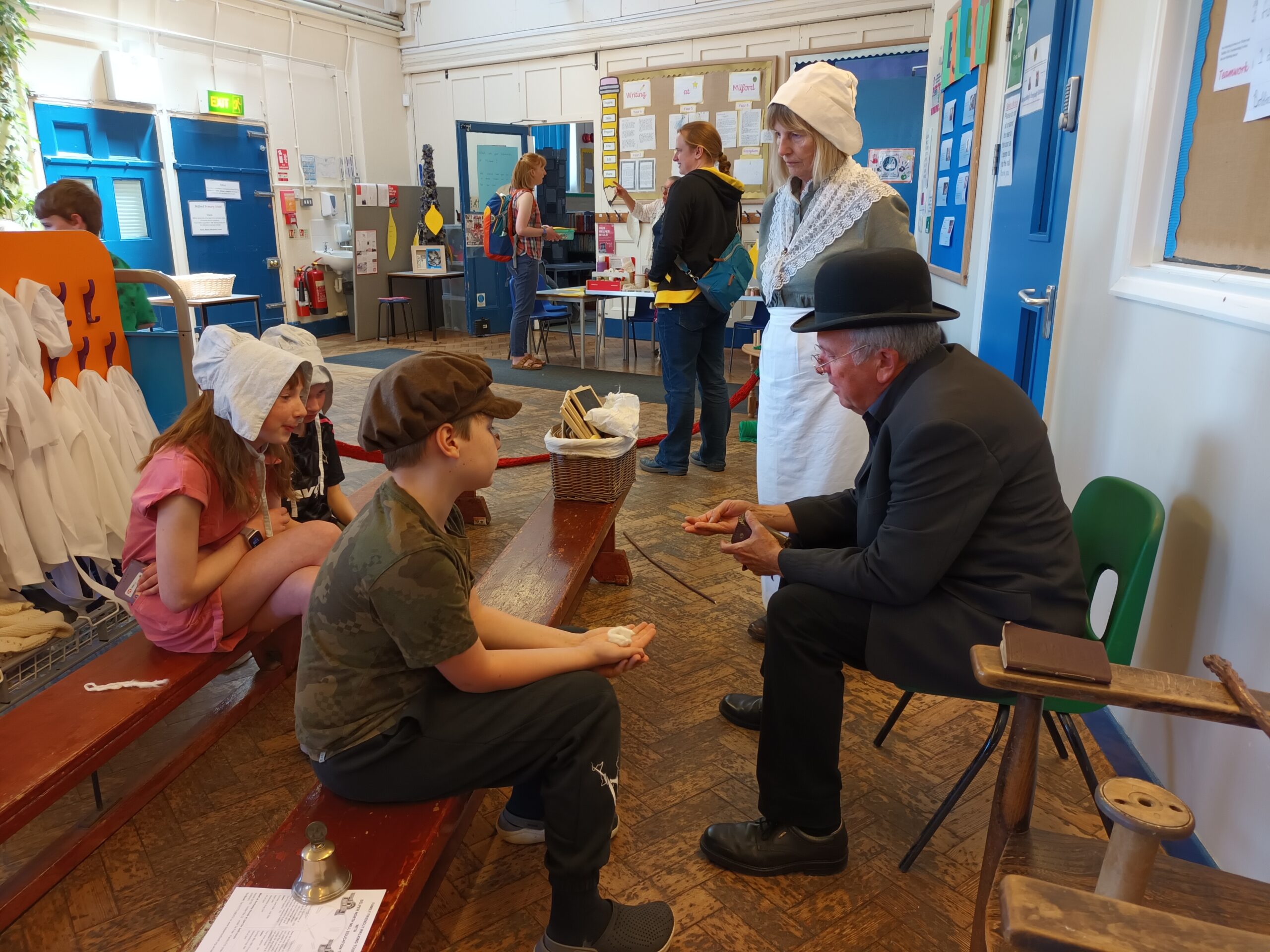 Belper North Mill volunteer, Gary Johnston, showing children how the early school was run.
