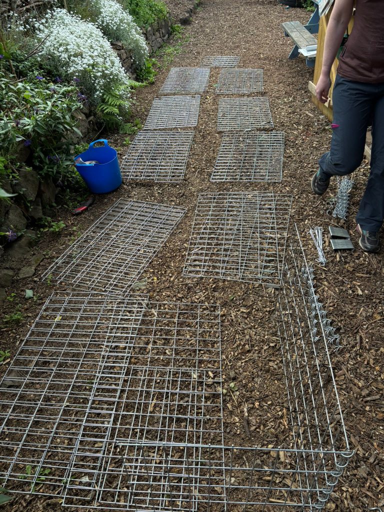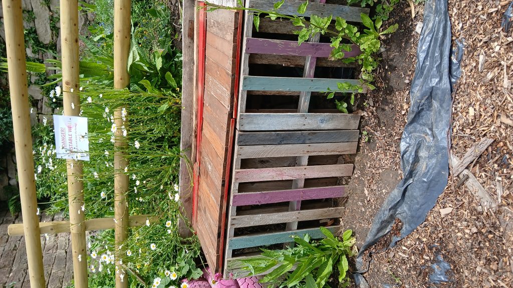These were used to create three new larger and improved compost bins and a more vigorous composting regime enforced. We also created a new fourth bin to store excess chipped bark for the paths.