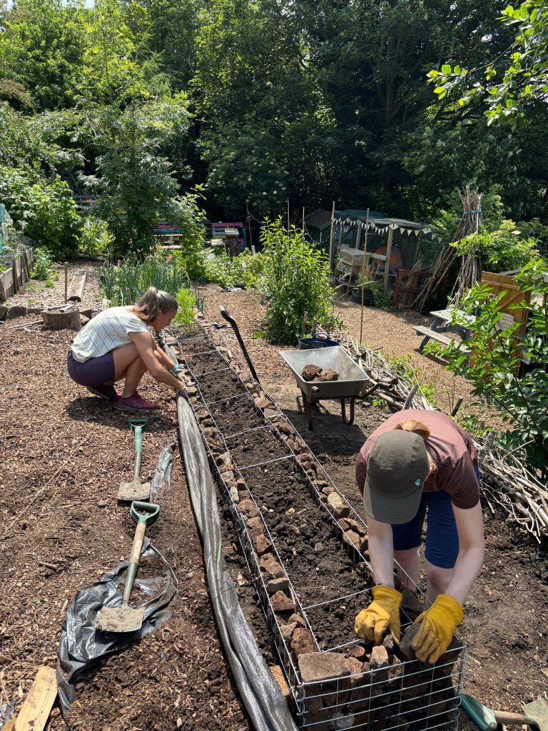 The site is very steep and constantly needs to be shored up. We have used railway sleepers successfully on parts of the site, but they are expensive and very heavy to carry, so in other parts we have just used wooden planks. After 5 years these are now beginning to rot so are being replaced. In probably the biggest project on the site this year, we have replaced one large section of rotting planks shoring up the Tinker Zone with a gabion wall, purchased using Greenspace funds. The first section was constructed in June. First a large amount of soil had to be moved and the the metal framework buried. The outer layer was then filled with stones from the Greenspace and other allotments, and the inner layer filled with soil.