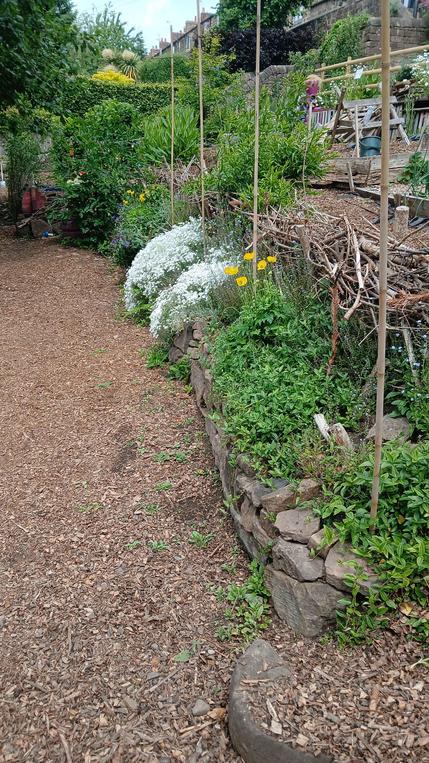 Wildflower garden May 2025 including new fence paid for by the landowners (Strutt Estate) ro keep people away from potentially dangerous wall.